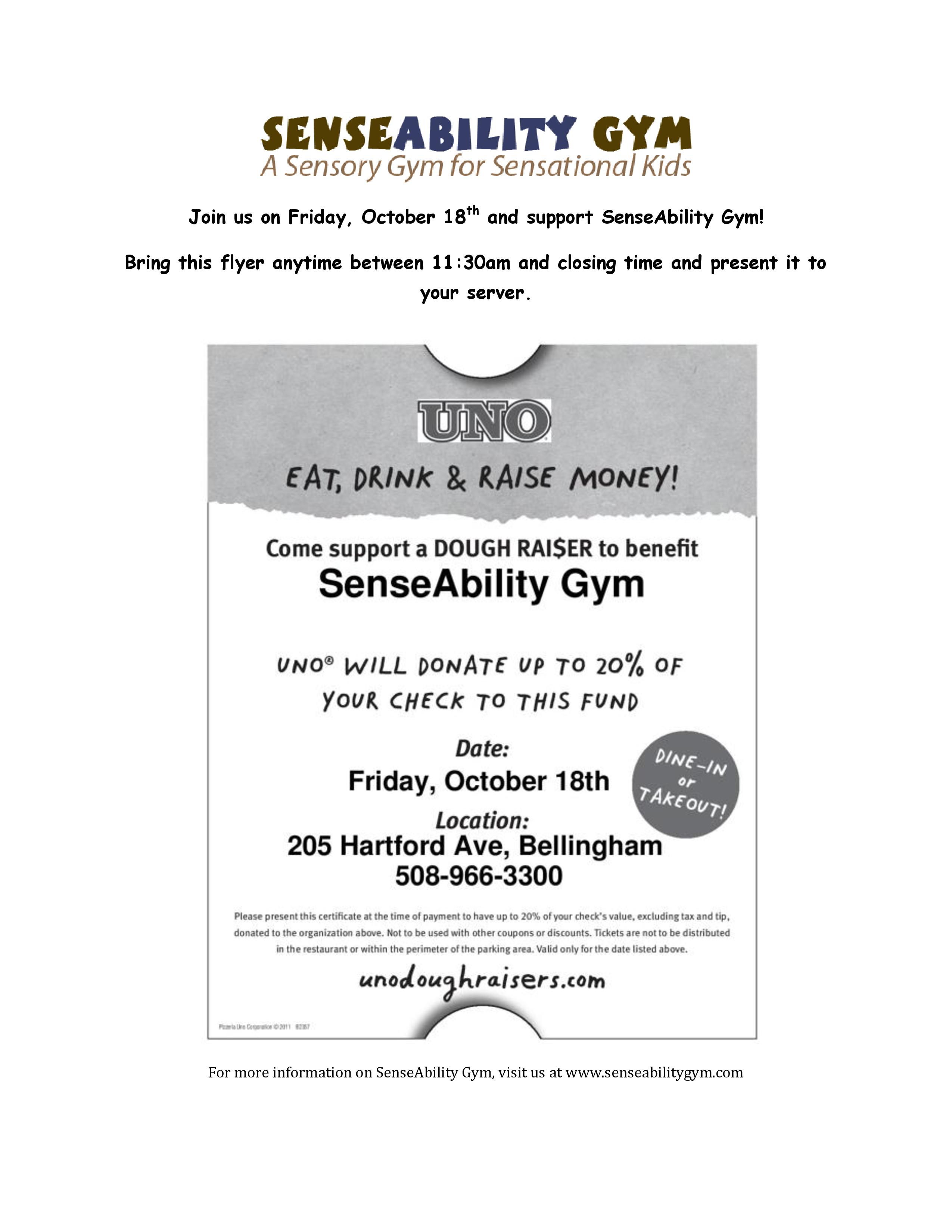 On October 18th, SenseAbility Gym will be holding a “dough raiser” with Uno’s Pizza in Bellingham! Click on the picture and print the flyer to help SenseAbility Gym receive up to 20% of your bill! The flyer is good all day on the 18th – come in for lunch, dinner or a late night snack and support us! Take out too!